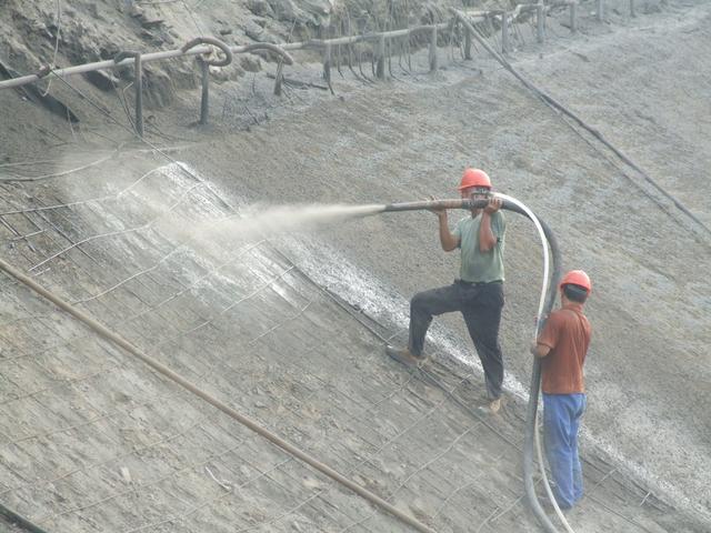 潮噴:是將骨料預加少量水,使之呈潮濕狀,再加水泥拌和,從而降低上料、拌和和噴射時的粉塵。但大量的水仍是在噴頭處加入和噴出的,其噴射工藝流程和使用機械同干噴工藝。目前施工現場較多使用的是潮噴工藝。